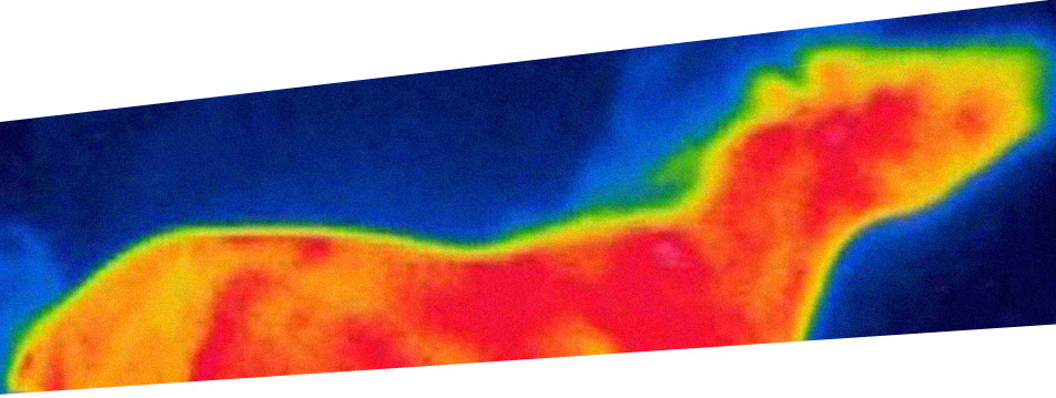 The work is created from the infrared recording of a horse’s body cooling after its death. The life size projection, projected on the floor or on the wall, shows the blood-red figure of the horse slowly vanish from the screen as its body looses its heat. The recording is edited to 25 minutes loop.